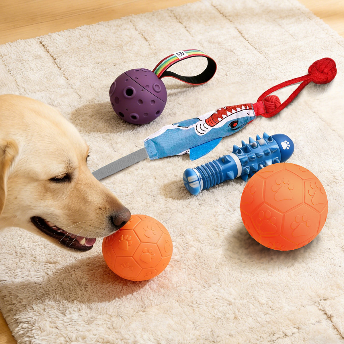 Juego de 5 juguetes interactivos para perros, ideal para masticar, entrenar y aliviar el aburrimiento.